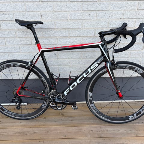 Aerocykel med kolfiberram i storlek Large. Fälgbroms. Däcken är tubeless ready.