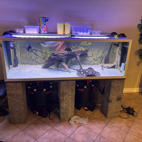 720 liters akvarium, inklusive Eheim Professionel 3 pump, 100 kg grus och, om man är lite snabb på det, ett gäng blandade fiskar (20-25 st) (Svärdbärare, platy, Black Molly, fåtal kardinaltetror, sorgmanteltetra, och lite annat. Plus en liten ancistrus. ca 50 st blå neocardinia räkor i olika storlekar.