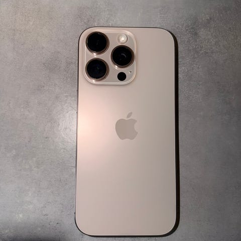 Apple iPhone 15 Pro smartphone med 256 GB intern lagring. Modellen har en ljus/vit baksida och tre bakre kameror. Skärmen är en helskärmsdisplay med Dynamic Island. Enheten på bilderna visar batterihälsa, användningsdata och leveransdatum. Telefonen kan användas för vardaglig kommunikation, surf, appar, foto och video. Förvaringsask och ett skyddande skal syns också på bilderna.