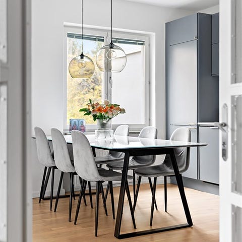 Elegant matgrupp från ILVA – glasbord med 6 svarta skinnstolar