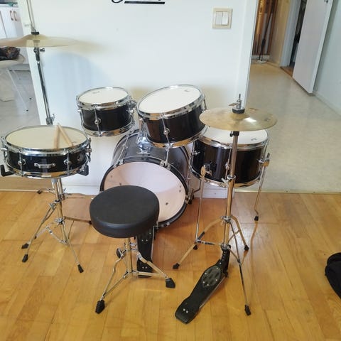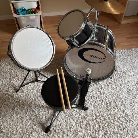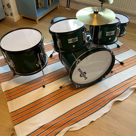 Gear4music trumset i grönt utförande. Setet består av bastrumma med pedal, två pukor varav en monterad på bastrumman samt pall. Passar som kompakt trumset för hemmabruk eller övning. Trummorna har metallstativ och sitsen är höjdjusterbar. För mer detaljer, se deras hemsida: https://www.gear4music.se/sv/Trummor/Junior-3-bitars-Trumset-fran-Gear4music-Gront/2MMQ