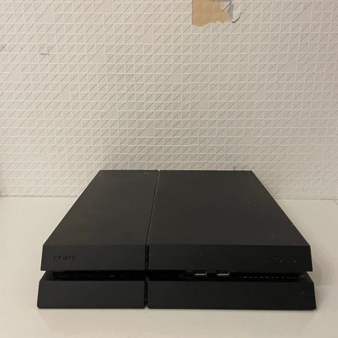 Sony Playstation 4 spelkonsol i svart färg. Standardmodellen av PS4 med anslutningar på baksidan för ström, HDMI, nätverkskabel och USB. Konsolen är avsedd för TV- och skärmanslutning via HDMI och fungerar för spel, film och andra mediafunktioner som stöds av Playstation 4-systemet. Bra skick men såklart använd med glädje.