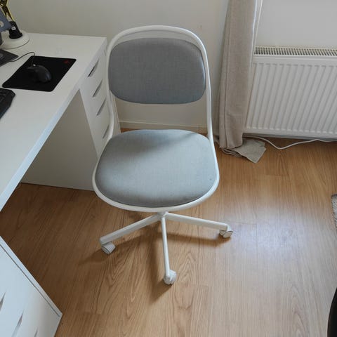 IKEA skrivbord med rak bordsskiva i träutförande och tillhörande hurts med två lådor. Skrivbordet har plats för arbete, studier eller dator. Medföljer gör även en kontorsstol med blå sits och rygg samt svarta armstöd och hjulunderrede. Passar för hemmakontor, barn- eller tonårsrum.