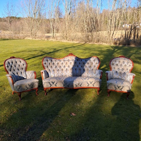 Soffgrupp bestående av en 3‑sits soffa och två fåtöljer. Möbelgruppen har stoppad sits och rygg med hög rygg på både soffa och fåtöljer. Klädsel i beige tyg med blommigt mönster. Armstöd och ben i ljust trä. Passar som sittgrupp i vardagsrum eller gäststuga.