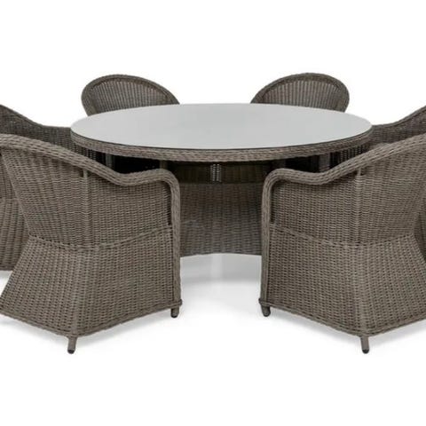 Matgrupp med rektangulärt utdragbart bord och sex stolar i mörkgrå färg. Bordsskivan har ribbad design och kan förlängas med iläggsskiva enligt bilderna. Stolarna har höga ryggar och flätad struktur med armstöd. Passar som utomhusmöbel på altan, trädgård eller uteplats beroende på material och väderförhållanden.