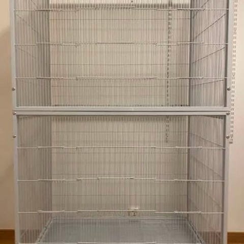 Rejäla lås, fyra mat- och vattenskålar i rostfritt stål. Leksaker eller tillbehör kan köpas till.