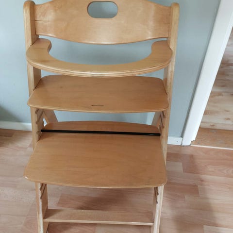 Stokke Tripp Trapp barnstol i naturfärgat trä. Klassisk justerbar barnstol där både sits och fotstöd kan höjd- och djupanpassas efter barnets storlek. Stolen är utformad för att barnet ska kunna sitta vid ett vanligt matbord och ger stöd för både rygg och fötter. Passar från småbarnsålder och uppåt beroende på hur stolen justeras.