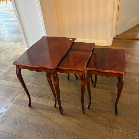 Tre små runda soffbord i mässing, grön och silver med svarta metallben.