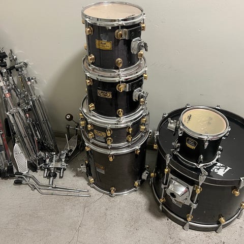 Akustiskt trumset i svart utförande från Pearl. Setet består av bastrumma, virveltrumma, pukor, cymbaler och hi-hat monterade på stativ.