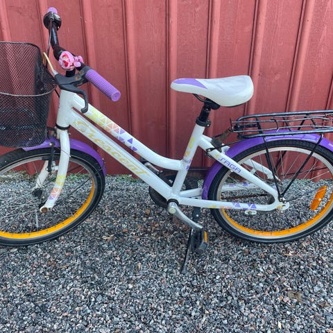 Barncykel med 16" hjul i vit färg. Utrustad med pakethållare bak, korg fram, reflexer och kedjeskydd. Passar mindre barn som behöver en cykel i storleken 16 tum för vardagsbruk och kortare cykelturer.