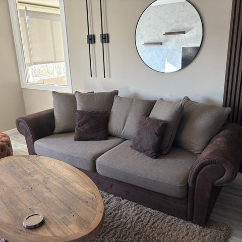 Fyra år gammal soffa säljes. Har tvättats regelbundet med möbeltvättmaskin och är på bilden precis nytvättad och håller på att torka, därför ser sittdynorna mörkare ut där de fortfarande är fuktiga. Har efter tvätt flyttats till ett förråd för förvaring.