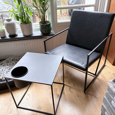 Säljer en snygg och bekväm loungestol tillsammans med ett stilrent sidobord i trä. Perfekt för läshörnan, uterummet eller vardagsrummet.