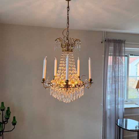 Fint skick med komplett uppsättning prismor. Ger ett exklusivt och varmt intryck både tänd och släckt.