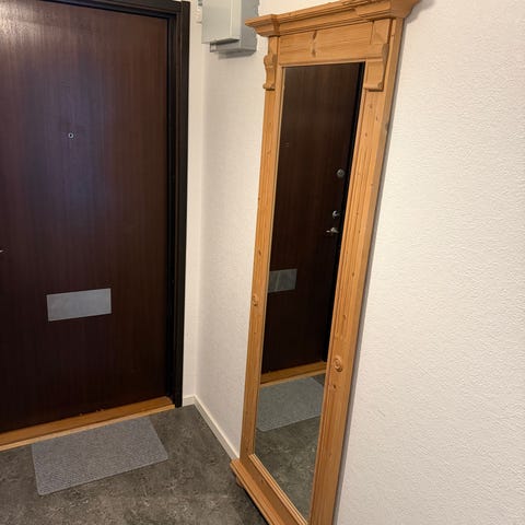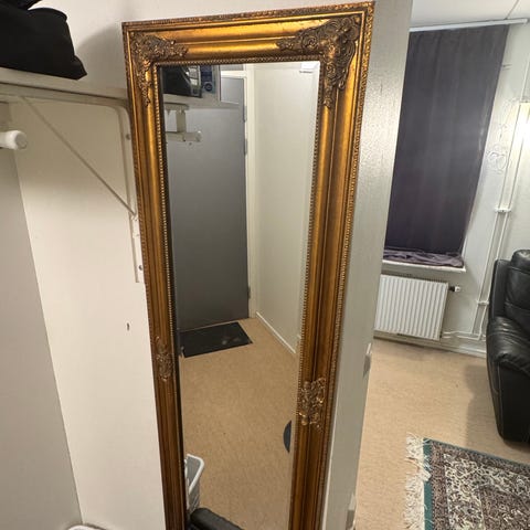 Säljer en stor och dekorativ spegel med vacker, detaljerad ram i klassisk/vintage stil. Perfekt som statement piece i hall, vardagsrum eller sovrum.
