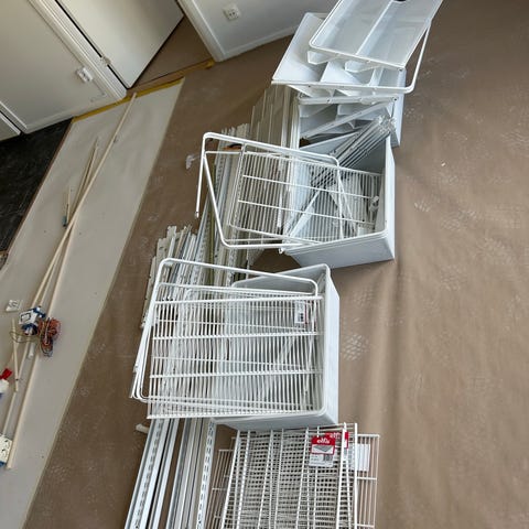 Säljer en komplett uppsättning hyllor som har varit monterade in en Ikea 50×202×58 cm garderob. Det är allt komplett och fungerande, med skruvar och täckbrickor. Jag behövde bara garderoben. Se bilder.