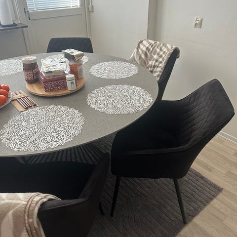 Säljer nu vår stilrena matgrupp i mycket fint skick då vi ska möblera om. Gruppen består av ett runt bord och fyra matchande stolar som ger en lyxig och modern känsla till hemmet.