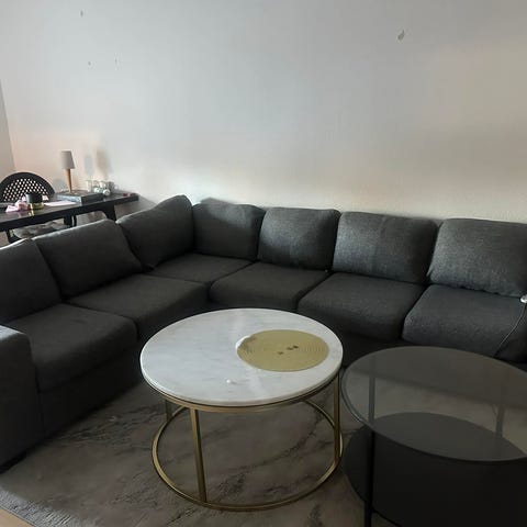 Ellos modulsoffa i grå textil. Soffan består av flera moduldelar som kan placeras tillsammans till en större hörnsoffa eller delas upp efter behov. Klädsel i enfärgat grått tyg och sitsar med raka linjer ger ett modernt uttryck. Passar som större sittgrupp i vardagsrum eller allrum.