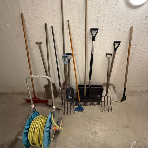 Trädgårdsredskap spadar skyfflar krattor och sekatör