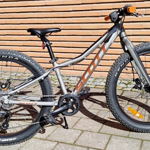 Scott 370 barncykel med 24" hjul. Cykeln har vit ram med röda detaljer och är utrustad med framgaffel med dämpning, skivbroms bak och fälgbroms fram. Utrustad med 21 växlar, kedjeskydd vid vevpartiet samt reflexer på hjulen.