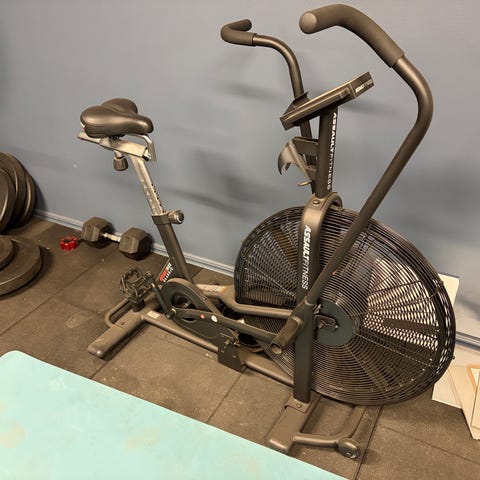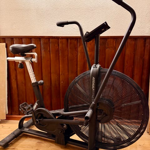 Assault AirBike Classic träningscykel. Luftmotstånd via stor fläkt framtill som ökar motståndet ju hårdare man trampar och arbetar med handtagen. Utrustad med display som visar bland annat tid, distans, kalorier, watt, hastighet och varvtal. Stabil ramkonstruktion och justerbart säte. Passar för konditionsträning och intervaller i hemmagym eller träningsrum.