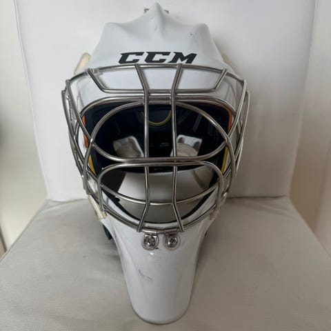 Säljer en riktigt snygg CCM Axis målvaktsmask med unik custom design i blått/rött/gult (riktigt iögonfallande på isen). Godkänd 2031