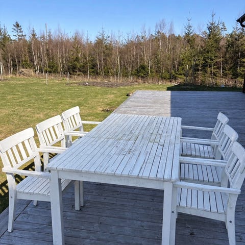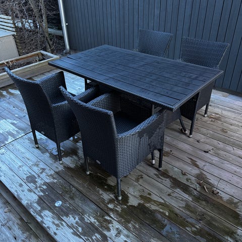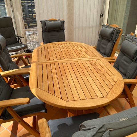 Jättefin matgrupp i teak & konstrotting säljes! Har stått inomhus & är därav i toppenfint skick. Bekväma stolar med lösa dynor.