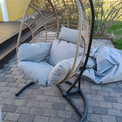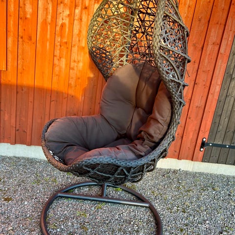 Hängfåtölj med stativ i grått tyg. Fåtöljen har en äggformad korg med vadderade, ljusa dynor för rygg och sidor. Stativet är i metall med kryssfot för stabilitet. Passar för användning utomhus på altan, uteplats eller liknande miljö beroende på materialets vädertålighet.
