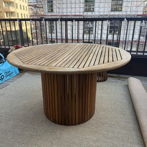 Ett åttakantigt teakbord för trädgården eller balkongen.