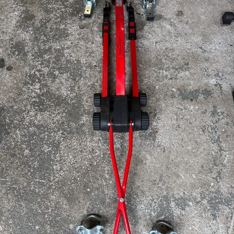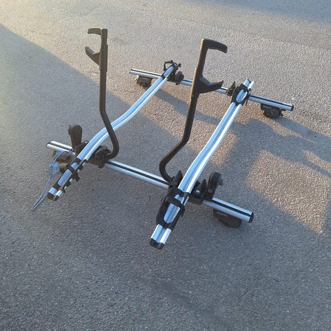 Takmonterad cykelhållare i svart färg. Monteras på takräcke för transport av cykel på bilens tak. Utrustad med arm för fastspänning av cykelram samt fästen för hjul. Passar standardtakräcken av rätt bredd och profil, kontrollera mått mot ditt befintliga takräcke.