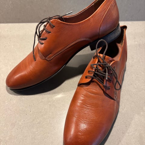 En fin sko som passar lika bra till finbyxor som till Jeans. Snörning. Liten klack med gummi sula.
