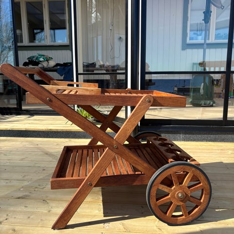 Serveringsvagn KWA, Sweden. Utomhus vagn med löstagbar bricka. Ihop fällbar. Längd ca 80, bredd 60, höjd 80 cm. Utomhus patina. Normalt bruksslitage - rullar fint. Se mina övriga annonser.