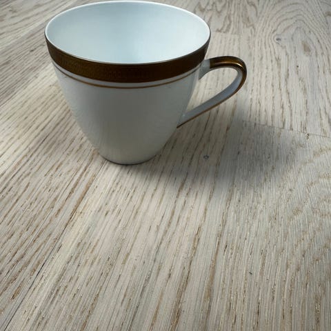 Denna servis i vitt porslin kännetecknas av sin handmålade eller tryckta dekor med blåsippor och eleganta förgyllda kanter. Just dessa koppar har en unik design med dekorativa "fötter" och sirligt rullade handtag i guld.