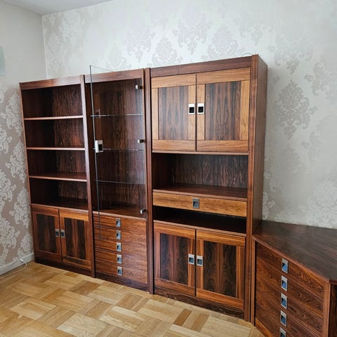 Vitrinskåp och hyllskåp i träfaner med glasdörrar. Vitrinskåpet har flera glashyllor och helglasad front för exponering av föremål. Hyllskåpet har öppna hyllplan upptill, ett klaffskåp i mitten samt skåp med dörrar och lådor nedtill för dold förvaring. Passar för förvaring och exponering i vardagsrum, matsal eller kontor.
