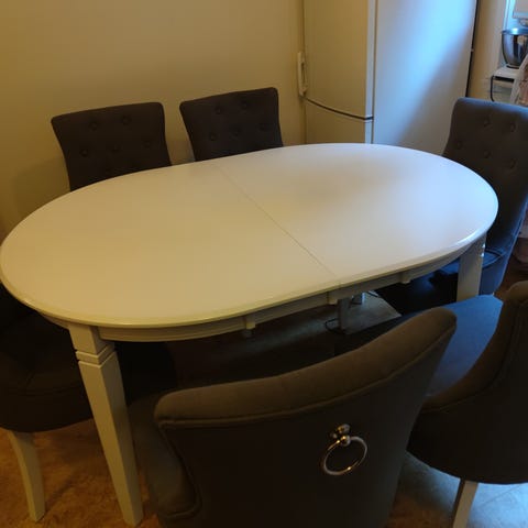 De grå stolarna är från JYSK. Hela matgruppen köptes för cirka 3 år sedan och är i fint skick.