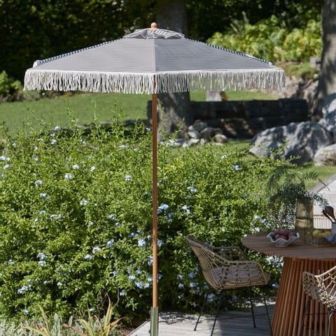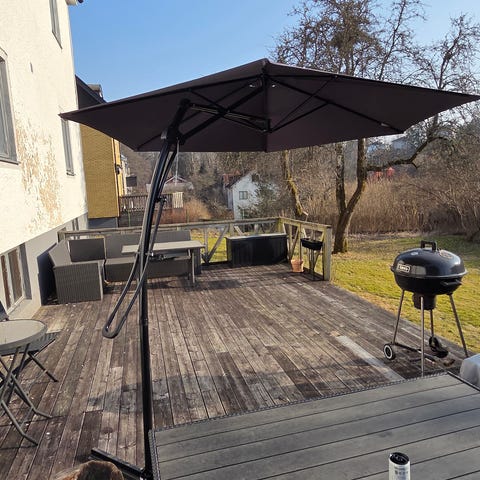 Parasolll från jysk med fransar i beige endast provad ute 1 gng som ny.