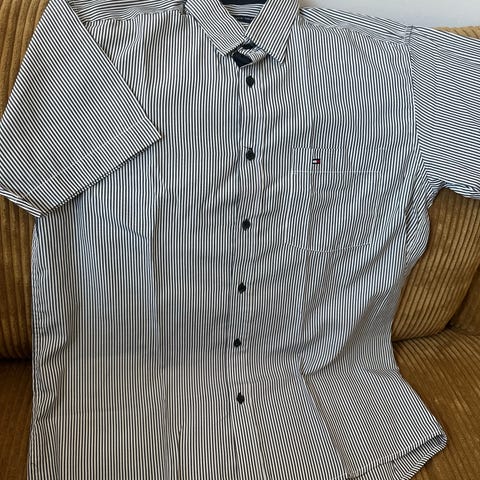 Tommy Hilfiger skjorta för herr i storlek M (hittar ingen lapp vad det är för stl men min far hade nästan M i allt) Skjortan är blå och tillverkad i bomull. Klassisk krage, knäppning framtill och manschetter med knappar. Passar som vardags- eller kontorsskjorta.