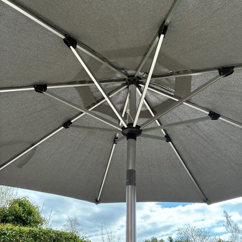 Isted parasoll från jysk diameter 200 cm och höjd cirka 233 cm. Duken är beige med olivfärgade med fransar.