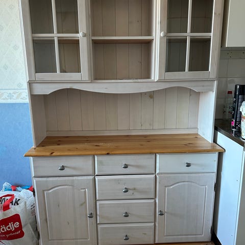 Vitt vitrinskåp i trä. Säljs med avhämtning i Båstad.
