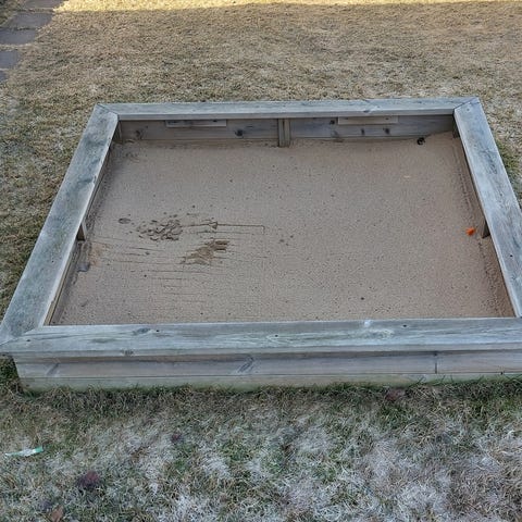 Sandlåda sandbehållare i grön plast med lock. Lådan är märkt med texten "SAND" på framsidan och har gångjärn och kedjor som håller locket på plats när det är öppet. Passar för förvaring av sand eller grus, exempelvis vid uppfart, gång eller entré. Robust konstruktion som kan användas utomhus eller inomhus efter behov. Hämtas i Hudiksvall