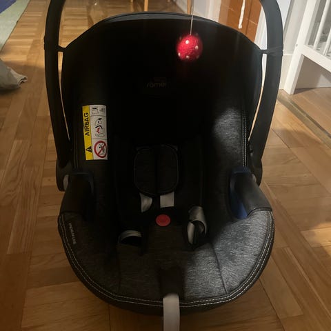 Britax Römer Primo babyskydd med ISO-fix basenhet. Basenheten går att fästa med bälte men då behöver man komplettera med en bältesklämma.
