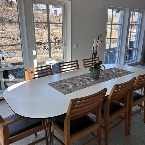 Mått stolar: Höjd 92 cm, bredd 38 cm, sittdjup 30 cm.