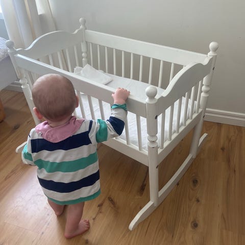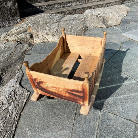 Trävagga från 1990 för barn i furu. Vaggan är utformad i massivt trä med dekorativa utskärningar på gavlarna och stående med medar som möjliggör gungning. Passar som sovplats för spädbarn. Botten består av träribbor där madrass kan placeras ovanpå. Lämplig för inomhusbruk i barnrum eller sovrum.