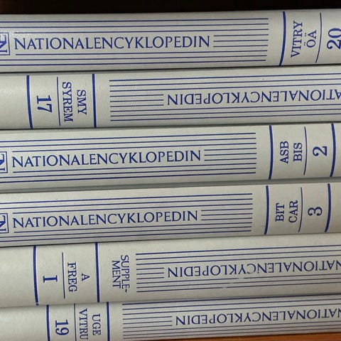 Nationalencyklopedin uppslagsverk i blå band. Inbundna volymer med hårda pärmar. Lämplig som referensverk i hem, skola eller på kontor för uppslagsläsning inom många olika ämnesområden.