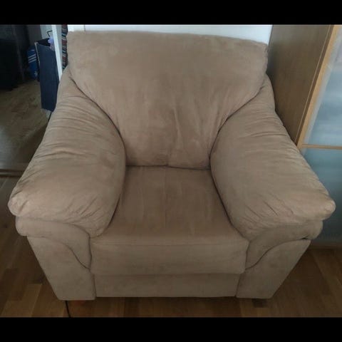 En fin fåtölj med fotpall. Inköpsställe oklart.