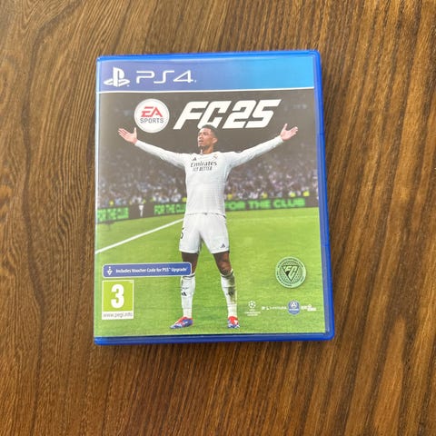 EA Sports FC 24 och EA Sports FC 25 spel till Playstation 4. Båda spelen levereras i sina originalfodral för PS4. Fotbollsspel med flerspelarläge och onlineläge, lämpliga för spelare från 3 år enligt PEGI-märkning. Passar för användning på Playstation 4-konsoler som stöder dessa titlar.