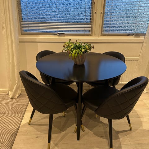 Matbord och 8 stolar ljusgrått tyg i absolut nyskick. 162 cm långt 100cm brett plus 2 iläggsskivor a 48 cm . Totalt 258 cm Inköpspris Ca 45 000kr.