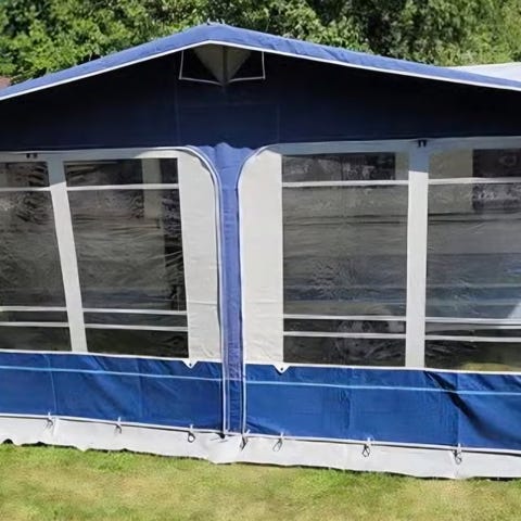 Förtält till husvagn i grå och svart färg med stora fönsterpartier och vita gardiner. Tältet har front- och sidodelar med fönster, samt ingång fram. Taket är ljust invändigt för bättre ljusinsläpp. Passar som extra uterum vid husvagn och ger skydd mot väder. Levereras med tältduk och markfästen enligt bilderna. Storlek och märke är inte angivna.