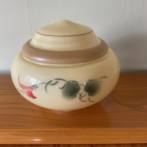 Taklampa/plafond, art deco, gräddvitt/ljusgult glas med vinröd/brun dekor. Välbehållen så när som på ett väldigt litet nagg (se bild) samt några nagg vid den råa kanten (dessa döljs när den är monterad).