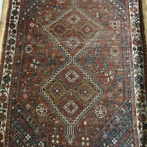 Persisk Shiraz matta i röd mönstrad design. Klassisk orientinspirerad rektangulär matta med central medaljong och dekorativa bårder längs kanterna. Flera nyanser av rött med inslag av mörka och ljusare toner samt geometriska motiv. Passar exempelvis i vardagsrum, sovrum eller hall som golvtextil och inredningsdetalj. Mått 1,5 x 1 meter