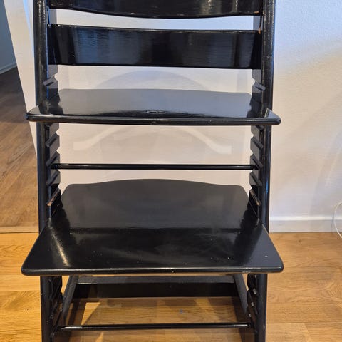 Leander matstol i svart färg. Justerbar sitt- och fotplatta som kan anpassas efter barnets längd. Stabil konstruktion i trä, utformad för att ge stöd vid måltider och annan sittande aktivitet vid bordet.